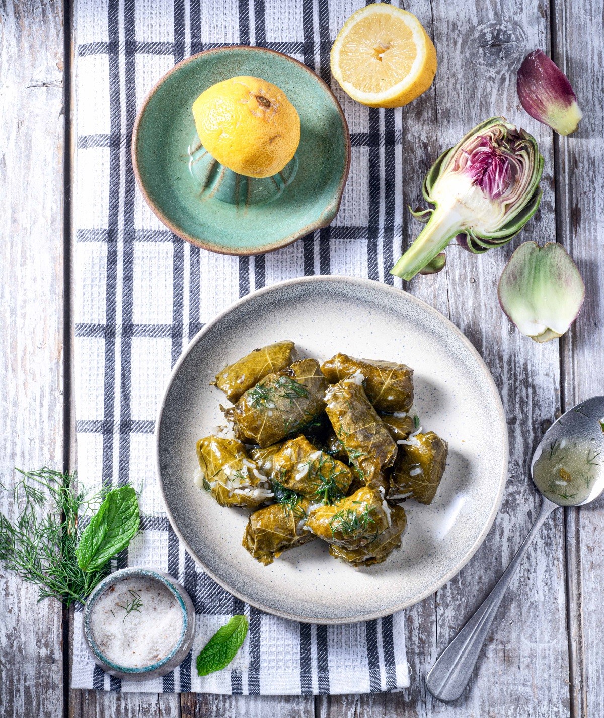 Ντολμαδάκια γεμιστά με αγκιναρόρυζο και σάλτσα μάραθου