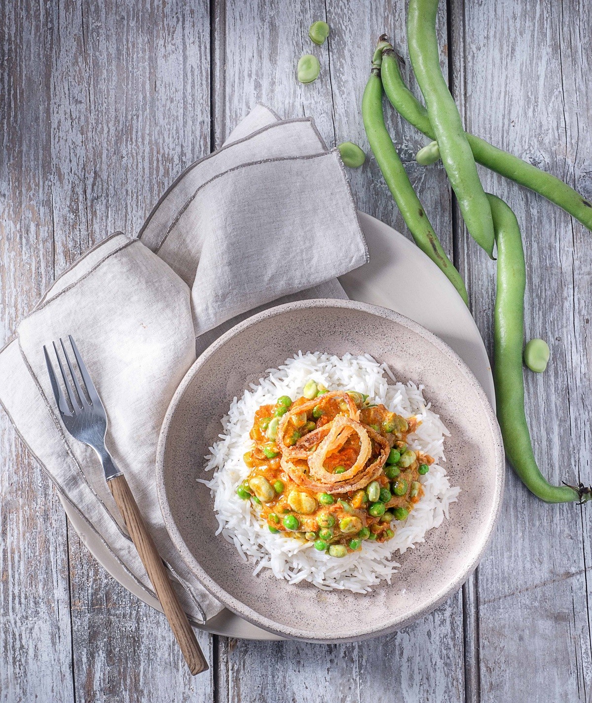 Αρακάς και κουκιά με πικάντικη σάλτσα, ρύζι basmati και τηγανητά κρεμμύδια