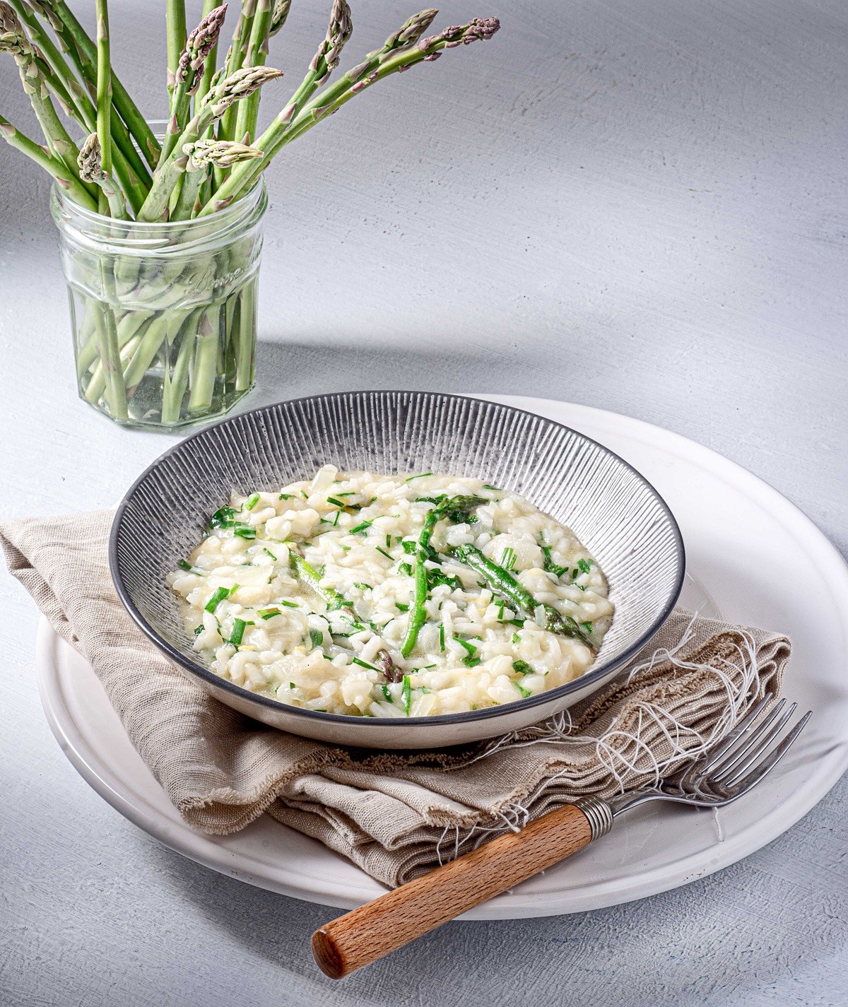 Σπαράγγια λεμονάτα με ρύζι καρολίνα και κασκαβάλι Λήμνου