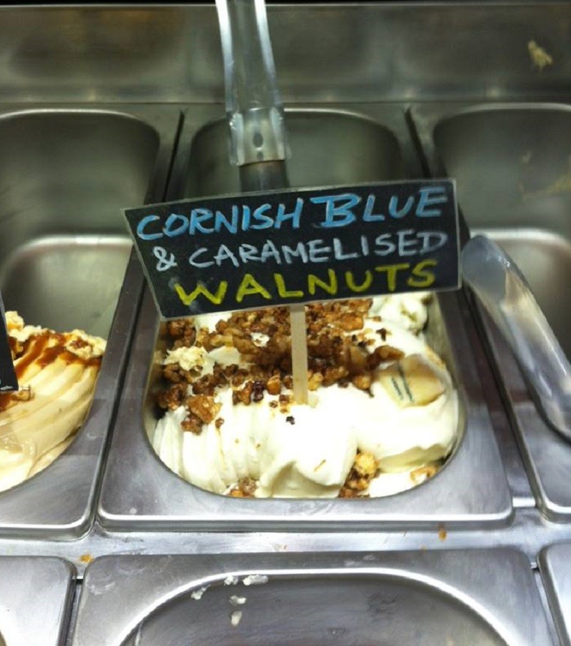 Το κατάστημα La Gelatiera στο Λονδίνο έκανε το blue cheese παγωτό, συνδυάζοντας το με ένα από τα καλύτερα συνοδευτικά του, τα καρύδια -στην καραμελωμένη εκδοχή τους φυσικά, μιας και πρόκειται για γλύκισμα. Βέβαια, λόγω της ιδιαίτερα έντονης γεύσης του, μόνο όσοι πραγματικά αγαπούν το τυρί μπορούν να το απολαύσουν.