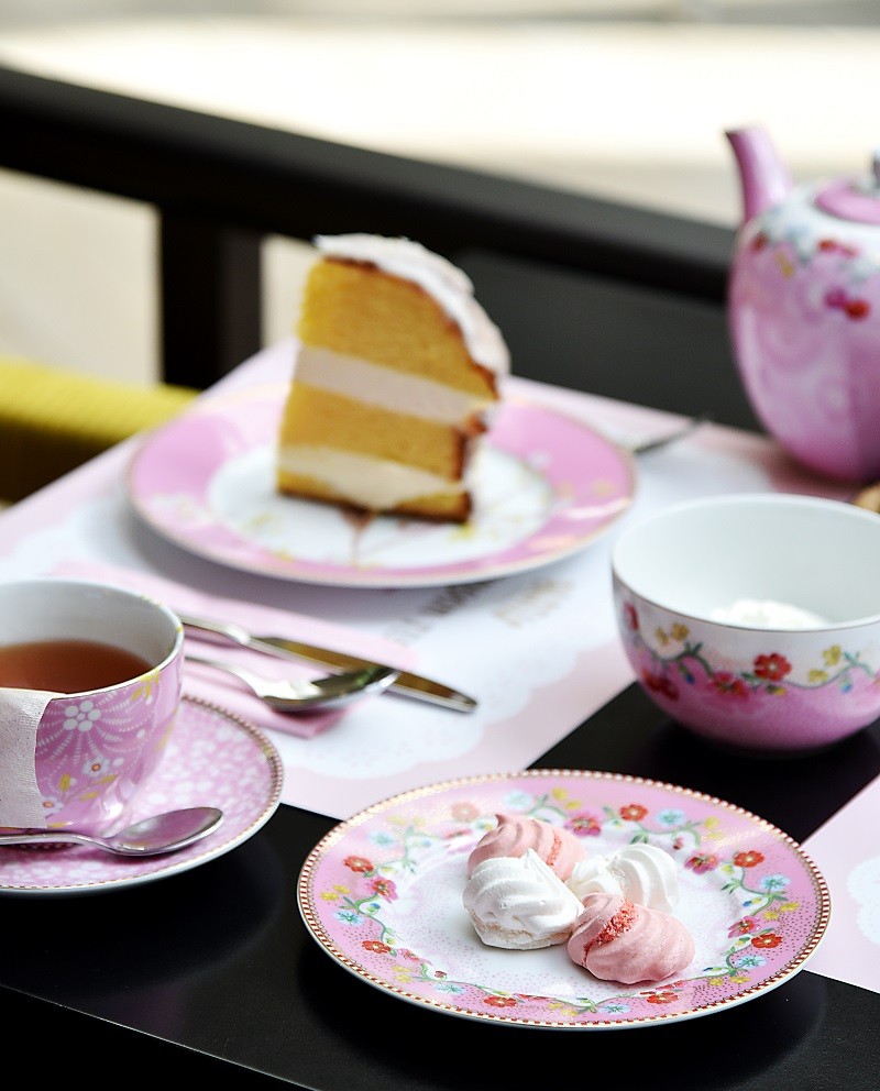 Ροζ λουλουδάτα σερβίτσια τσαγιού τοποθετούνται πάνω σε σουβέρ με επίσης ροζ αποχρώσεις, έτοιμα να υποδεχθούν αρωματικά τσάγια και βότανα Kusmi, που συνδυάζονται αρμονικά με τις γλυκές και αλμυρές δημιουργίες των σεφ Δημήτρη και Θανάση Σταμούδη. Finger sandwiches μεταξύ άλλων με αγγούρι, κοτόπουλο ή σολομό, υπέροχα κέικ τριαντάφυλλο και λεμόνι, αφράτες κρέμες, μπισκότα, τρούφες, χρωματιστές μαρέγκες, αλλά και ροζέ σαμπάνια Deutz, σερβίρονται πάνω στο επίσης ροζ trolley του Afternoon Tea, που έρχεται να συμπληρώσει ιδανικά την πιο girlie ατμόσφαιρα που έχουμε συναντήσει τελευταία, δημιουργώντας μας παράλληλα τεράστια διλήμματα -τι να πρωτοδοκιμάσουμε; Πάντως εμείς πήραμε μία γεύση από όλα και έχουμε να δηλώσουμε ότι θα επιστρέψουμε ξανά!