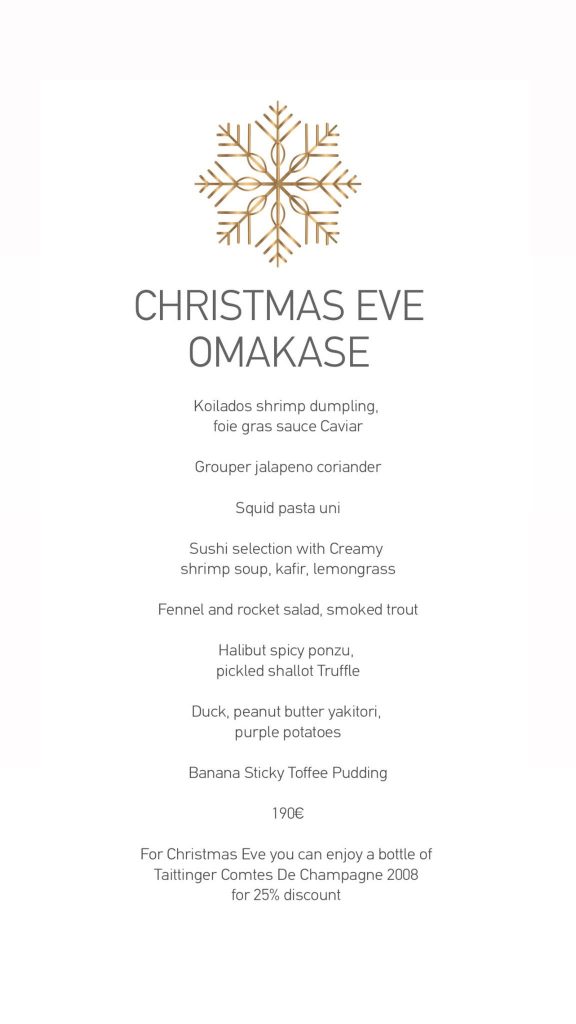 Για την Παραμονή των Χριστουγέννων όσοι βρεθούν στο Matsuhisa θα μπορούν να γευτούν πλούσιο γιορτινό menu οκτώ πιάτων, που παντρεύει μοναδικά τις εξαιρετικές πρώτες ύλες με ιδιαίτερες τεχνικές ή να επιλέξουν κάποιο από τα γκουρμέ πιάτα στο a la carte menu του εστιατορίου.