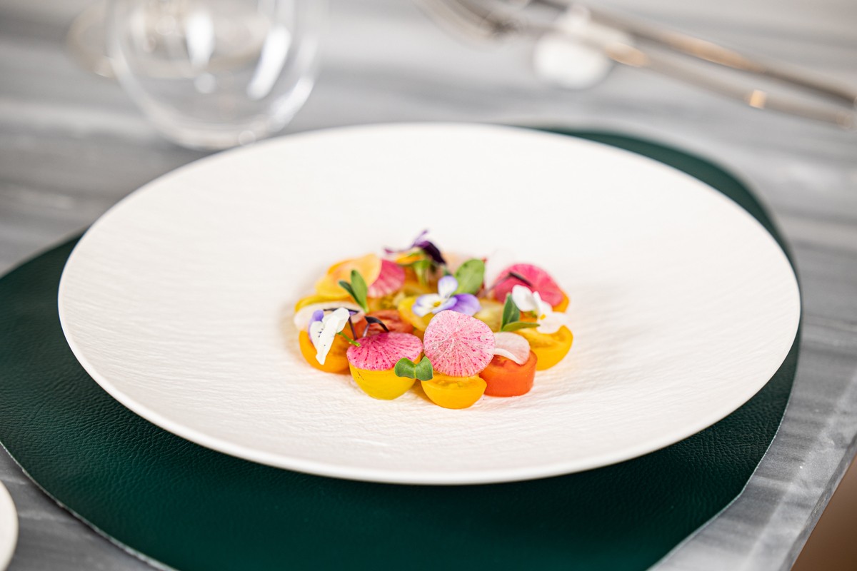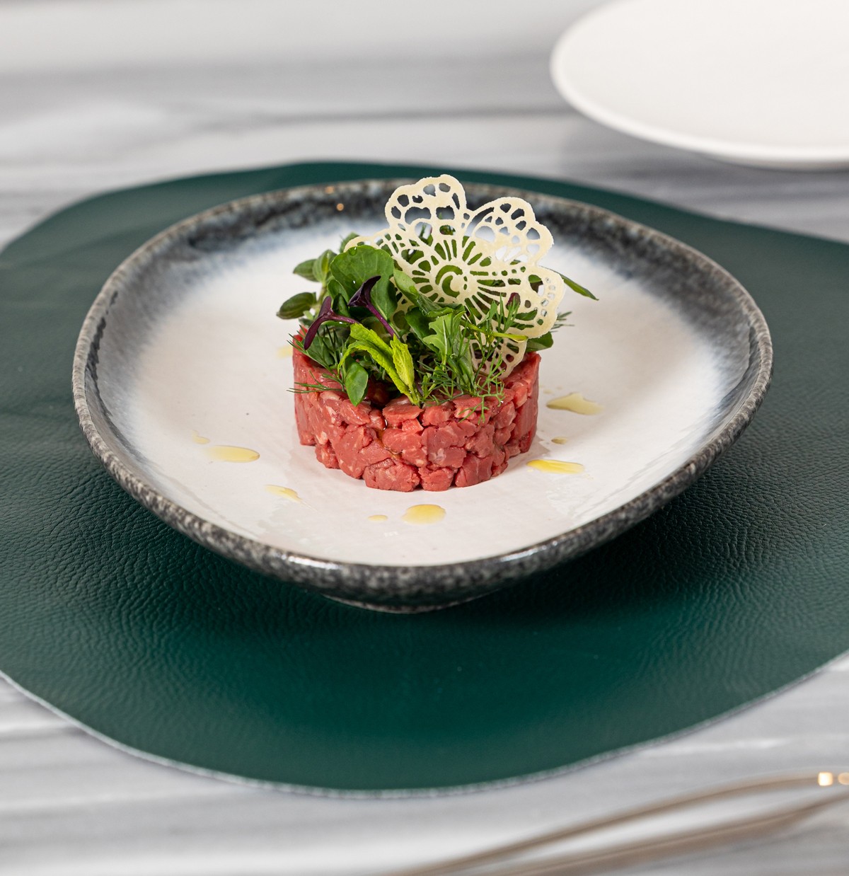 Στα 15 χειροποίητα τραπέζια του εστιατορίου επιλέχθηκε ξύλο ελληνικής δρυός και γκρι μάρμαρο Διονύσου, παντρεύοντας αρμονικά τα δύο ελληνικά υλικά, ενώ το περίτεχνο τραπέζι της υποδοχής από Τηνιακό σκούρο μάρμαρο υποδέχεται τους επισκέπτες.