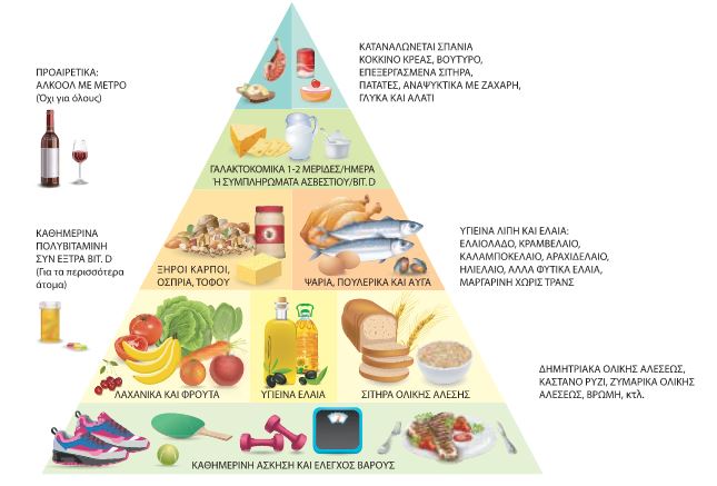 α.Η καθημερινή φυσική δραστηριότητα, το ιδανικό σωματικό βάρος και η τριάδα του γεύματος μαζί με το νερό, που τα τοποθετεί στη βάση της πυραμίδας.