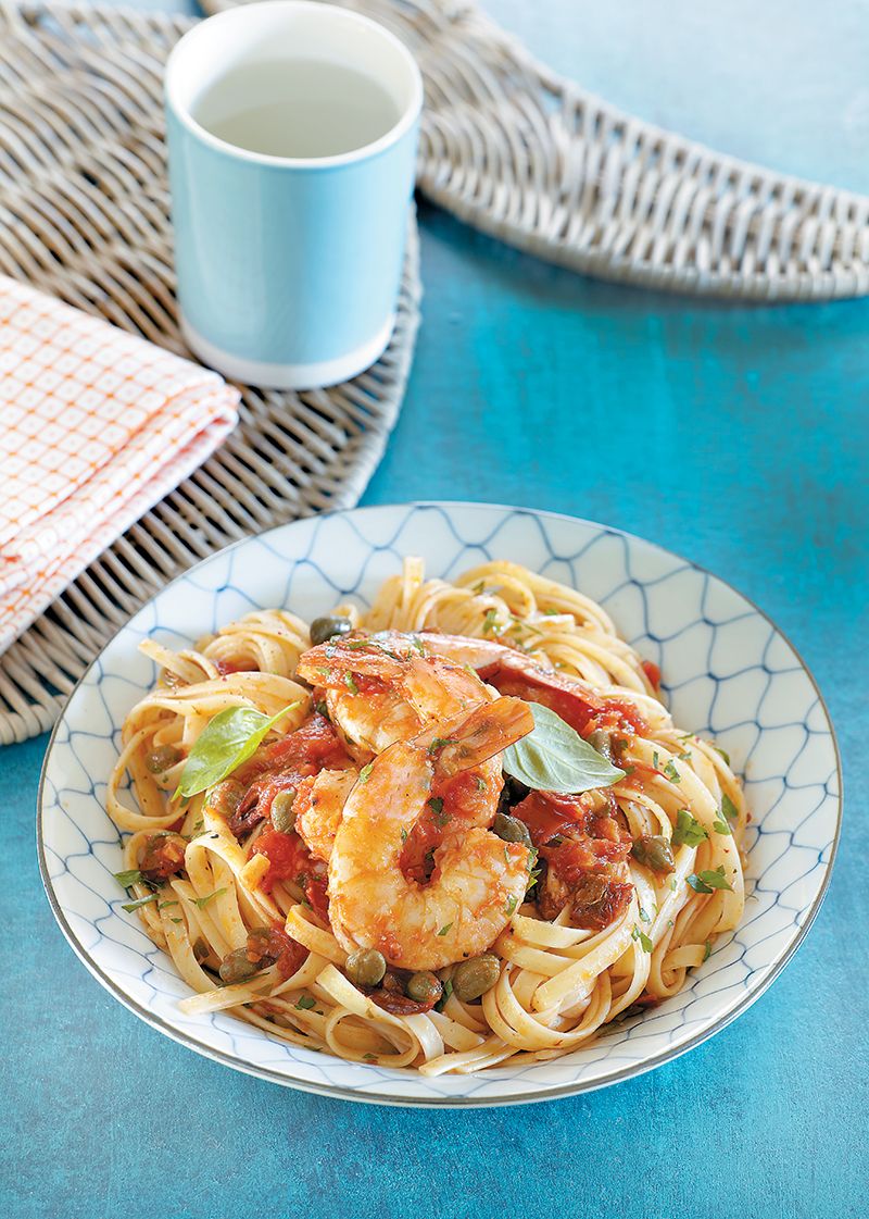 Λιγκουίνι με γαρίδες, ντομάτα, κάππαρη και βασιλικό