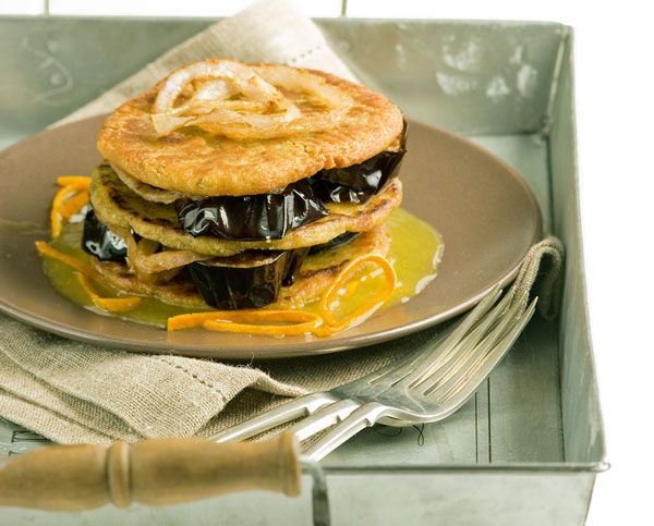 Μιλφέιγ από τηγανίτες ρεβιθιών και μελιτζάνα με σάλτσα πορτοκάλι