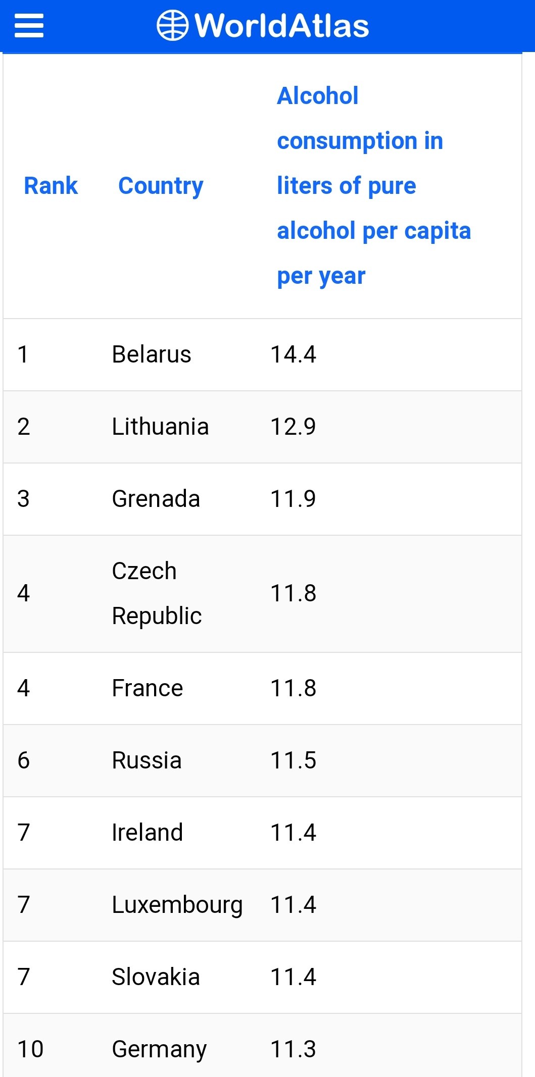 Η Γρενάδα βρίσκεται στην Καραϊβική Θάλασσα και σημειώνει κατανάλωση 11,9 λίτρων αλκοόλ ανά άτομο. Οπότε όχι μόνο βρίσκεται πολύ ψηλά στην κατάταξη της λίστας, αλλά έχει και τα υψηλότερα ποσοστά στην Αμερική.