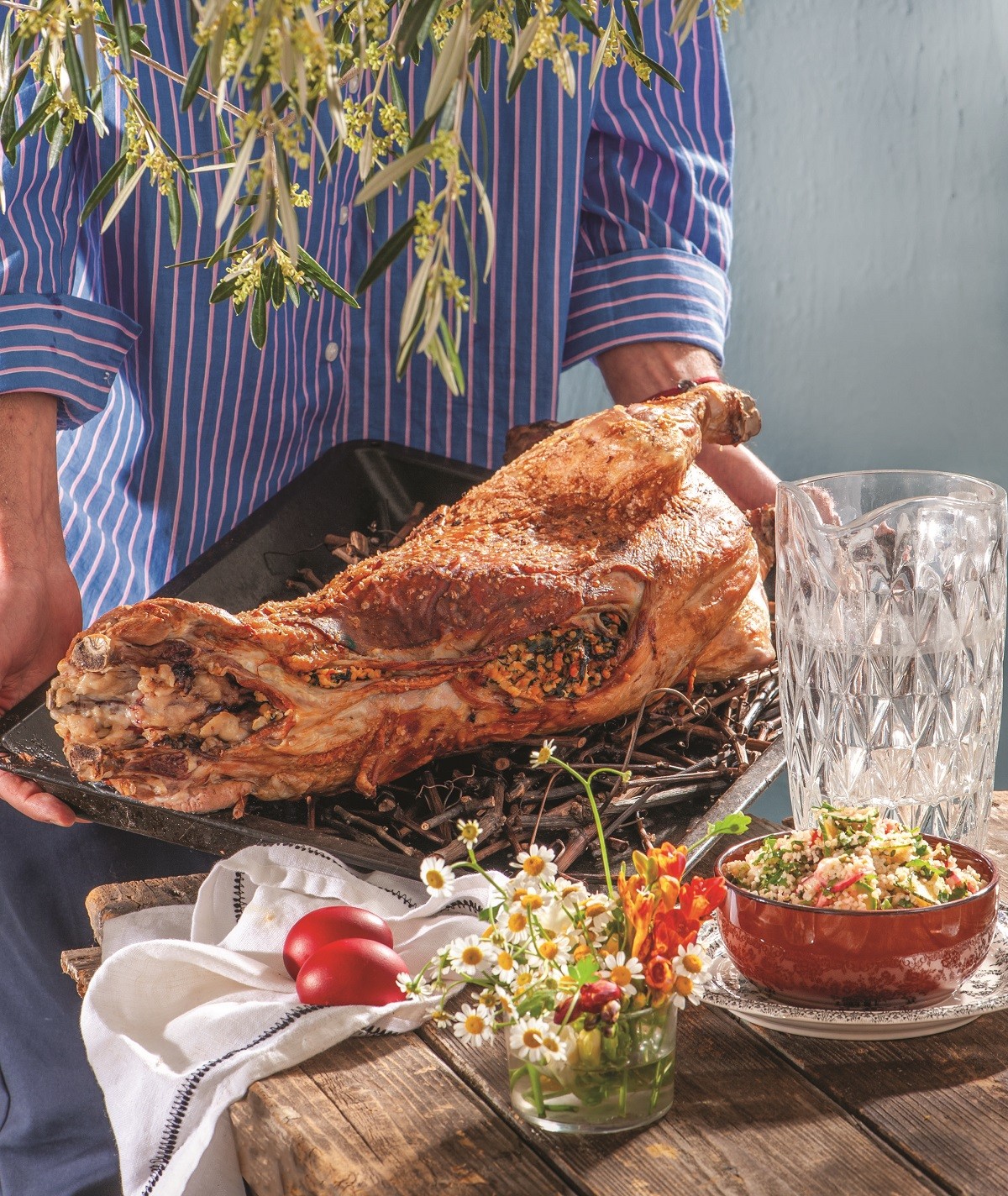 Κατσικάκι γεμιστό με σέσκουλα, μυρώνια και ξινομυζήθρα, στον ξυλόφουρνο