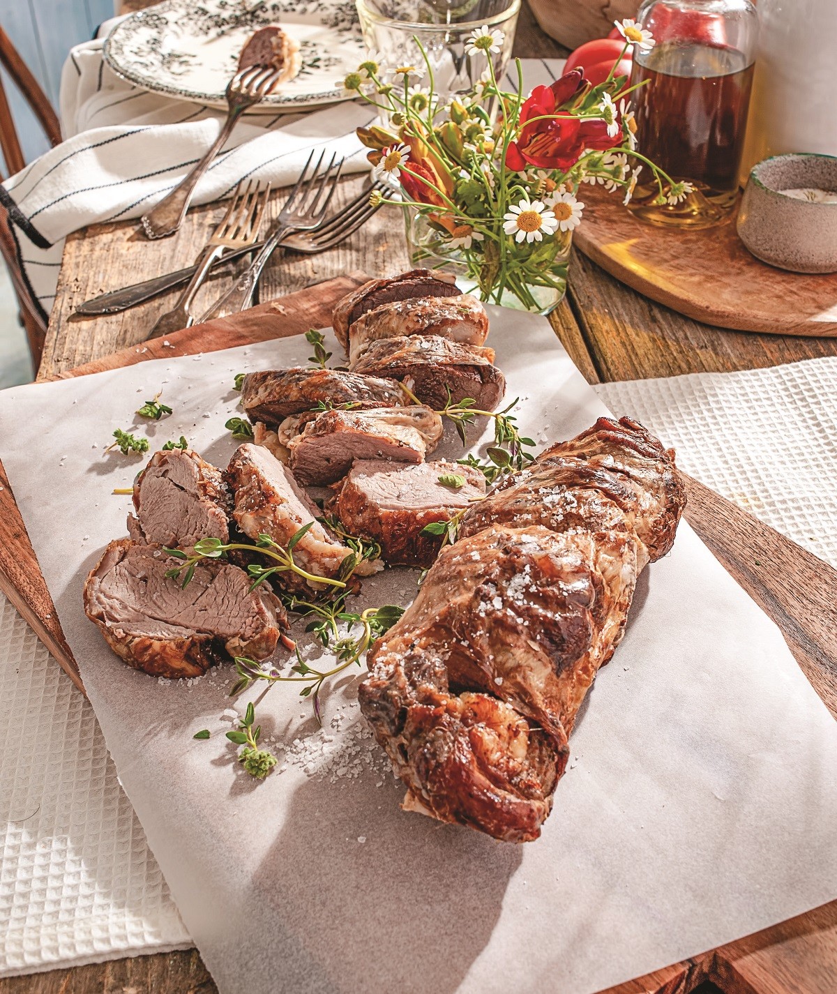 Ξεκινάμε ψήνοντας σε χαμηλή φωτιά στο κάρβουνο για 30 λεπτά κοντά στη φωτιά, κατόπιν ανεβάζουμε λίγο πιο ψηλά τη σούβλα και συνεχίζουμε το ψήσιμο για 1,5 ώρα. Ελέγχουμε ένα μικρό κομμάτι αν έχει ψηθεί και αν χρειαστεί ψήνουμε για 10-15 λεπτά ακόμη. Αφαιρούμε από τη φωτιά και αφήνουμε να σταθεί για 15 λεπτά. Εναλλακτικά ψήνουμε στον συμβατικό φούρνο για 2 ώρες στους 150οC και κατόπιν για 20 λεπτά στους 200οC. Κόβουμε σε λεπτές φέτες και σερβίρουμε με το μιξ από ρίγανη και θυμάρι.