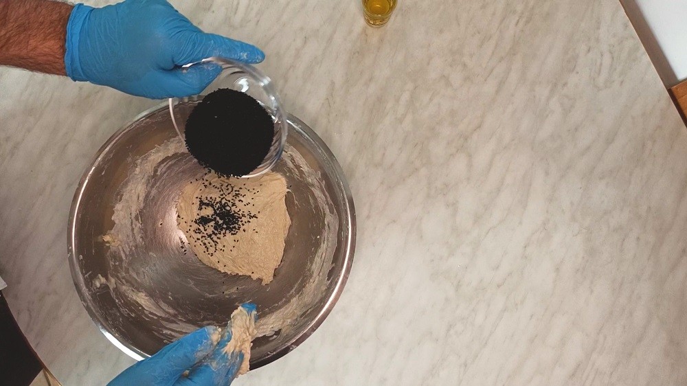 • Στη συνέχεια βάζουμε το υπόλοιπο από το αλεύρι μας και ζυμώνουμε για άλλα 7-8 λεπτά μέχρι να σχηματιστεί η ζύμη. Μετά ρίχνουμε το μαύρο σουσάμι μας για να κολλήσει σε κάθε σημείο της ζύμης λόγω της αυξημένης υγρασίας της.