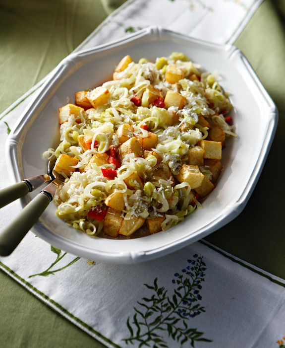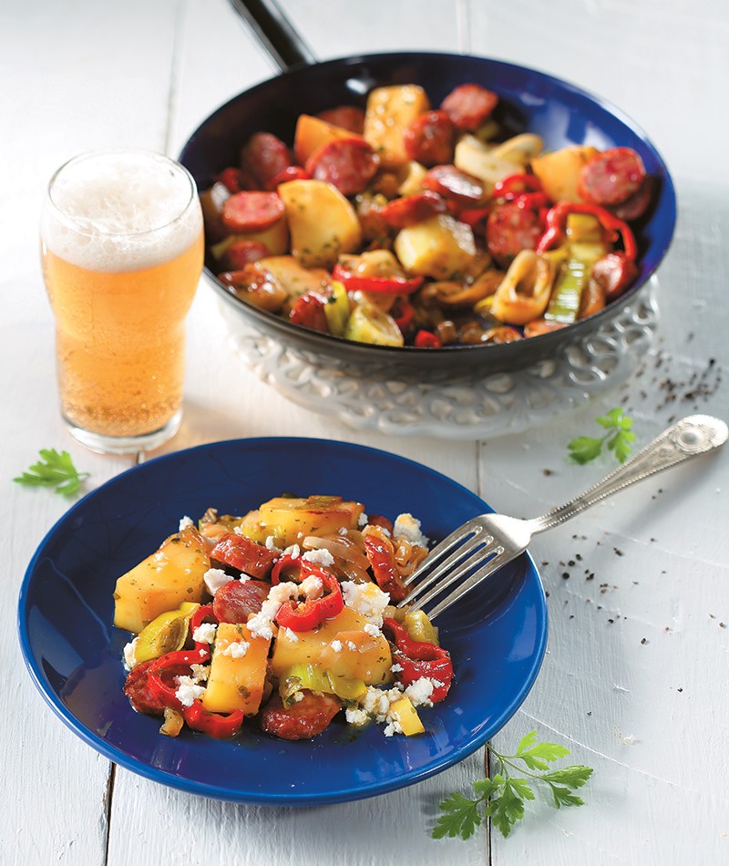 Πρασοτηγανιά με πατάτες, λουκάνικα και μυζήθρα