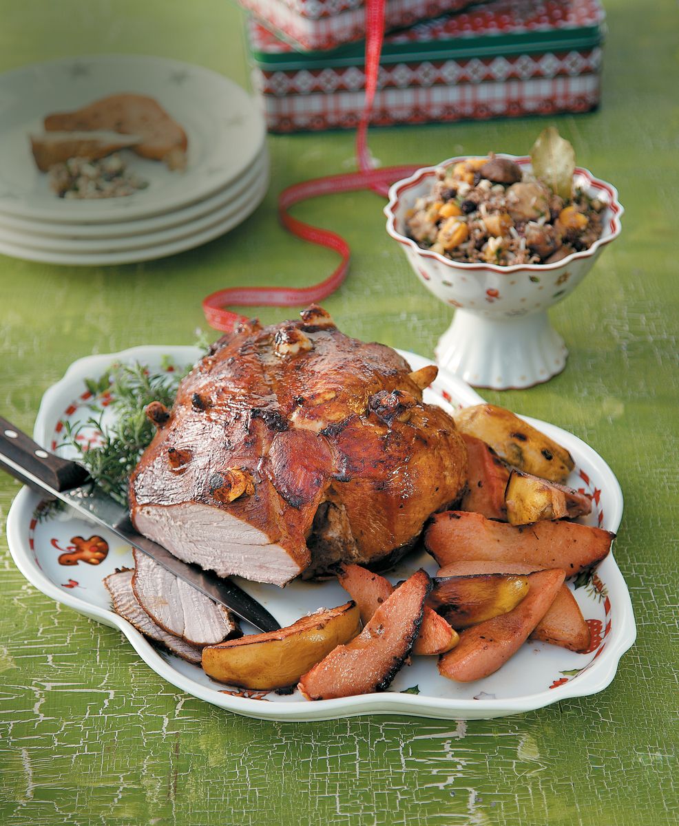 Χοιρινό μπούτι γαρνιρισμένο με γέμιση και σοταρισμένα κυδώνια