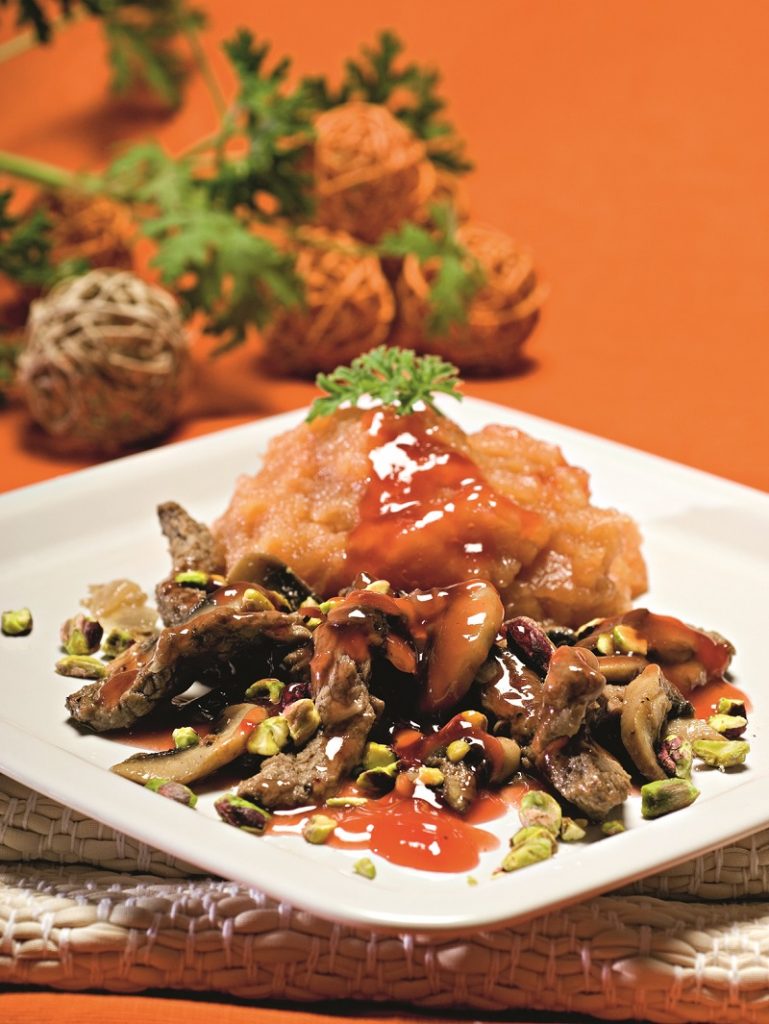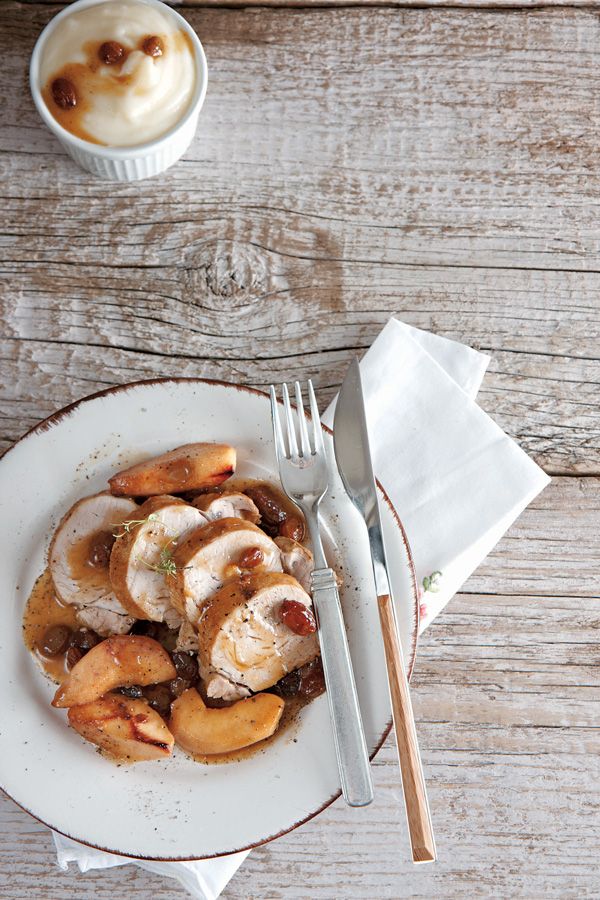 Γαλοπούλα με πουρέ πράσου, κυδώνια και δαμάσκηνα. Η γαλοπούλα συνδυάζεται αρμονικά με ένα φίνο πουρέ πράσου, κυδώνια και δαμάσκηνα δημιουργώντας ένα νόστιμο και ευφάνταστο πιάτο.