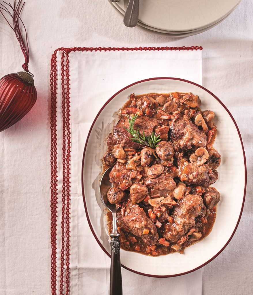 Μοσχαρίσια μάγουλα μαγειρεμένα σε κόκκινο κρασί, με κάστανα και καπνιστό μπέικον