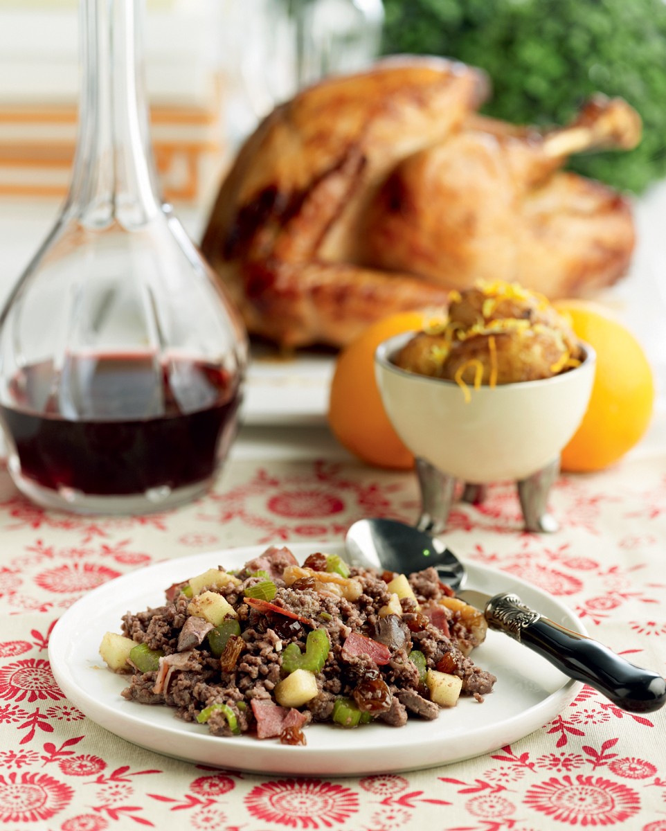 Γαλοπούλα γεμιστή με συκωτάκια, πράσινα μήλα, σταφίδες και μπέικον