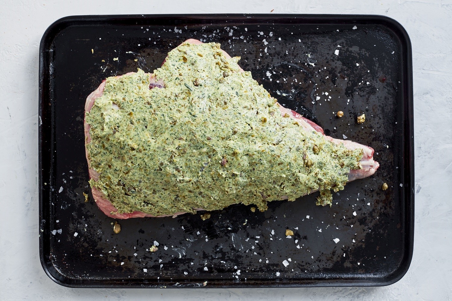 Αρνίσιο μπούτι στον φούρνο με βούτυρο κάππαρης και σάλτσα μαϊντανού