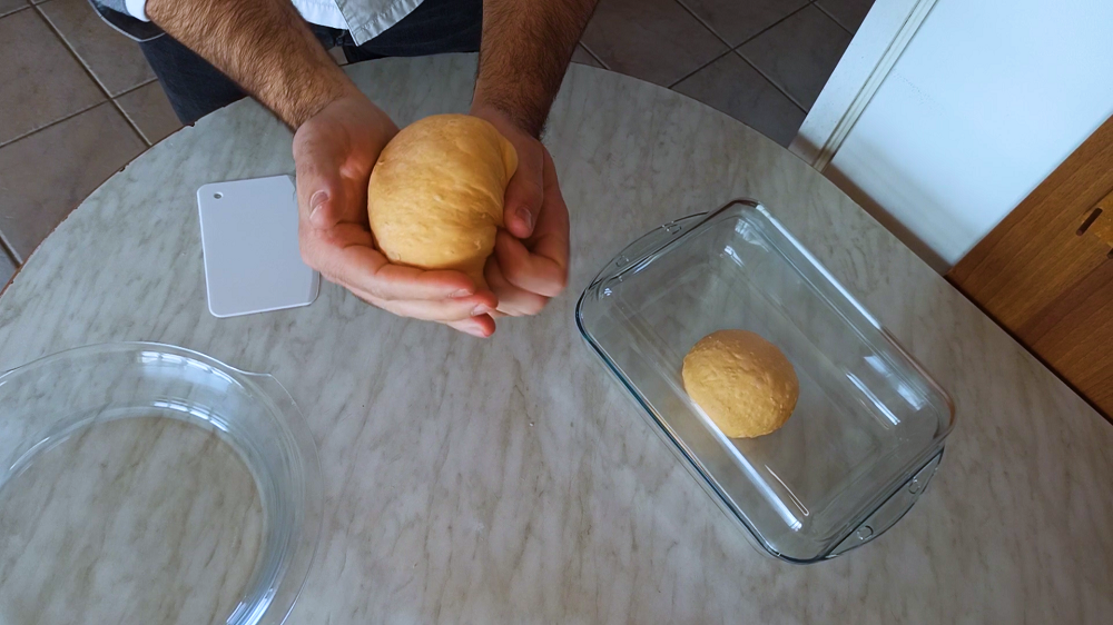 Μόλις σχηματιστεί η μπάλα μας την σκεπάζουμε και την αφήνουμε να ξεκουραστεί για 30 λεπτά. Την ξανασχηματίζουμε σε μπάλα ζυμώνοντας την ελάχιστα και ο λόγος που το