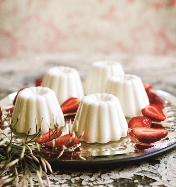 Πανακότα με γιαούρτι και ροδόνερο γαρνιρισμένη με φράουλες. Ένα δροσερό γλύκισμα ιδανικό για να κλείσει ένα όμορφο δείπνο.
