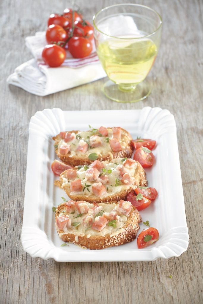 Οι μπρουσκέτες εδώ ψήνονται για λίγο στο φούρνο και η λιωμένη γραβιέρα με τη ρίγανη απογειώνουν τη γεύση τους. Σερβίρονται με ντοματίνια και μπορούν να πρoσφερθούν και ως μεζεδάκι.