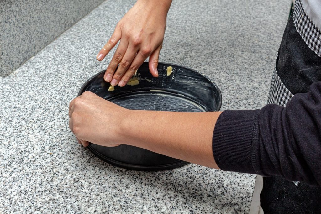 Για να μην κολλήσει το γλυκό μας στη φόρμα ή στο ταψί που το ψήνουμε, βάζουμε λίγο βούτυρο και αλεύρι. Απλώνουμε στο σκεύος λίγο βούτυρο με ένα πινέλο και πασπαλίζουμε με αλεύρι ώστε να καλύψουμε όλη την επιφάνεια. Αναποδογυρίζουμε και χτυπάμε απαλά για να τιναχτεί το περίσσιο αλεύρι. Με αυτόν τον τρόπο δημιουργούμε ένα προστατευτικό στρώμα και στη συνέχεια ρίχνουμε μέσα στη ζύμη μας. Δεν πρόκειται να κολλήσει.