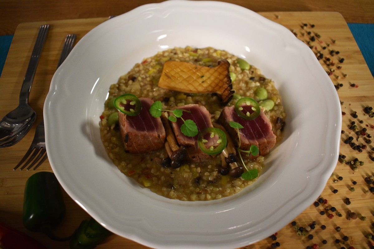 Τόνος με χυλωμένο φαγόπυρο και μανιτάρια