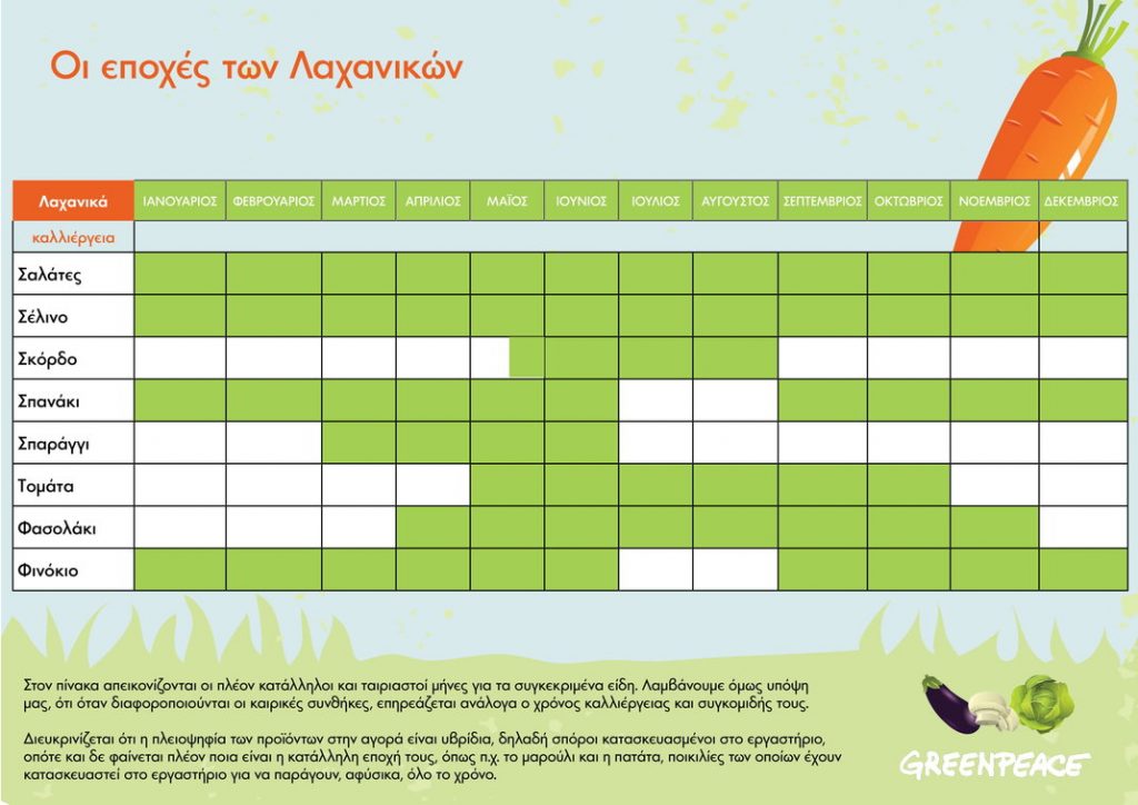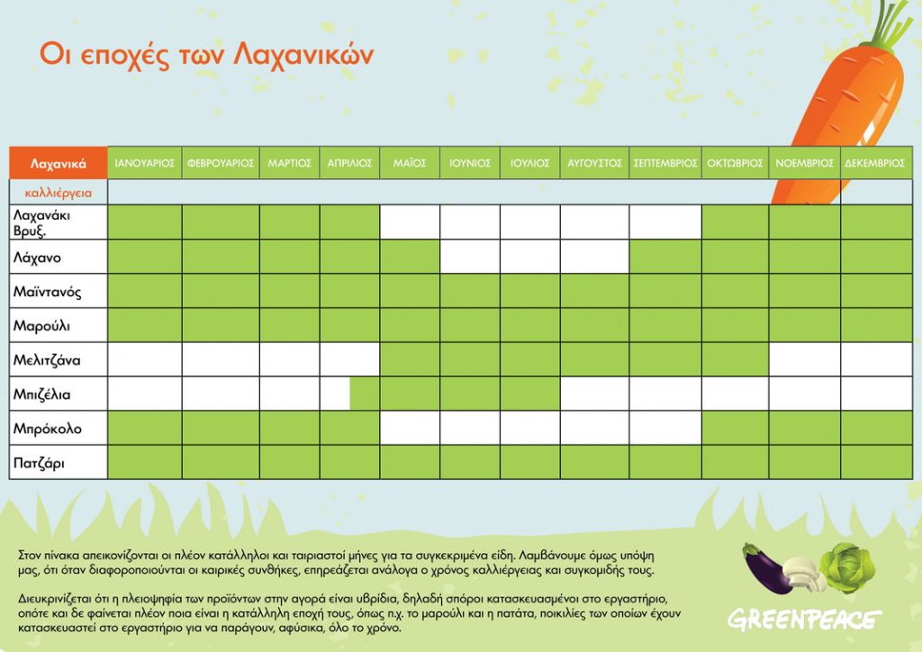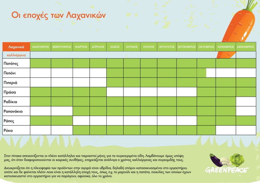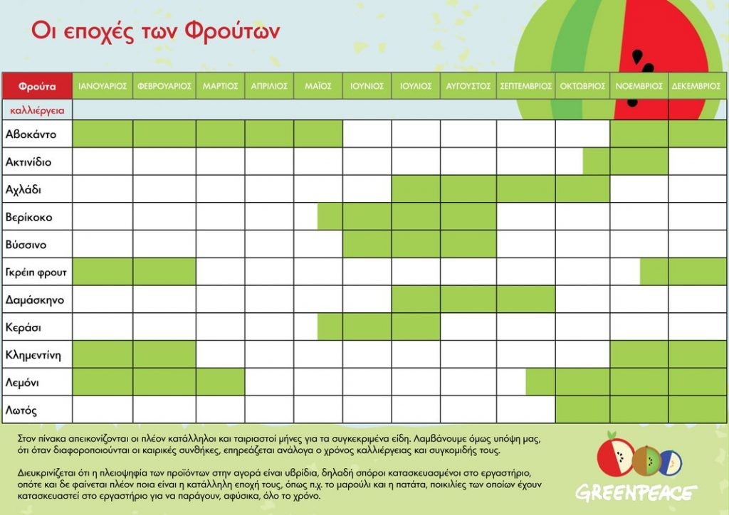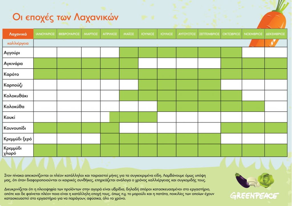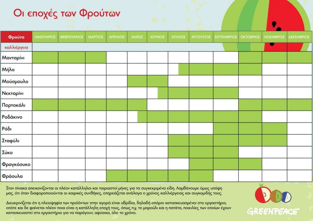 Γι’ αυτό η Greenpeace δημοσίευσε αναλυτικούς πίνακες για να ξέρουμε ποιοι μήνες είναι οι κατάλληλοι για να απολαύσουμε τα πιο δημοφιλή φρούτα και λαχανικά. Όταν αγοράζουμε τα οπωροκηπευτικά στην εποχή τους, ξέρουμε ότι καταναλώνουμε την πιο φρέσκια, φυσική και θρεπτική εκδοχή τους.