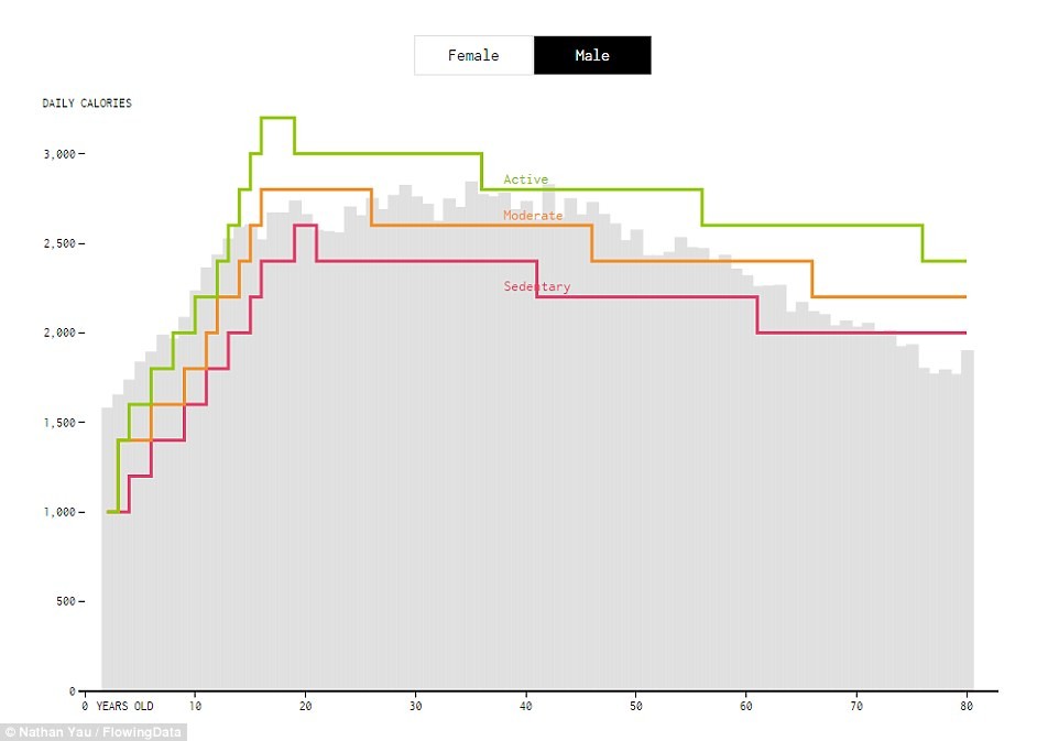 Οι θερμίδες που χρειαζόμαστε σε καθημερινή βάση εξαρτώνται τόσο από το φύλο και την ηλικία όσο και από τις συνήθειές μας, όπως για παράδειγμα το πόσο συχνά γυμναζόμαστε. Ο στατιστικολόγος Νέιθαν Γιάου από το Πανεπιστήμιο UCLA της Καλιφόρνια συγκέντρωσε στοιχεία από το Αμερικανικό Υπουργείο Υγείας και βάσει αυτών δημιούργησε τα παρακάτω γραφήματα, τα οποία θα σάς λύσουν όλες τις απορίες!