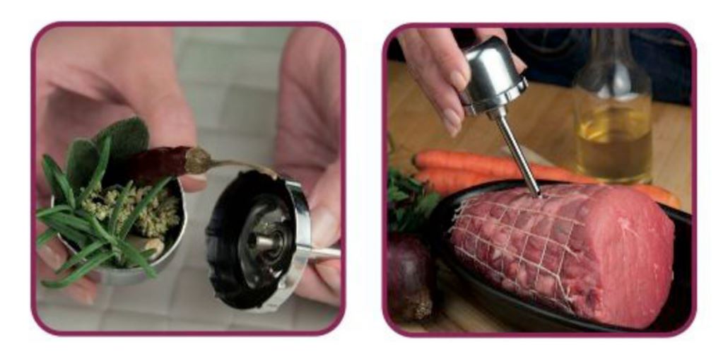 Πρόκειται για ένα δοχείο μπαχαρικών με ακίδα ειδικά σχεδιασμένο για να εμπλουτίσει γευστικά το κρέας κατά τη διάρκεια του ψησίματος και όχι πριν από αυτό. Γεμίζετε το δοχείο με νερό, ξίδι, ελαιόλαδο, ζωμό ή κρασί και προσθέτετε τα μυρωδικά και τα μπαχαρικά της αρεσκείας σας. Βάζετε στη συνέχεια την ακίδα στο δοχείο και την τοποθετείτε στο στο κομμάτι κρέατος που έχετε επιλέξει. Οι οπές της ακίδας θα πρέπει να καλύπτονται. Η υψηλή θερμοκρασία διαχέει τα αρώματα και τις γεύσεις μέσα στις ίνες του κρεάτος. Για καλύτερο αποτέλεσμα, χρησιμοποιείτε το δοχείο μπαχαρικών κατά το μέσο της διάρκειας του ψησίματος. Το βρήκαμε στο Chef Style Home Edition (chefstylehome.com/el/). Τιμή: 11.90