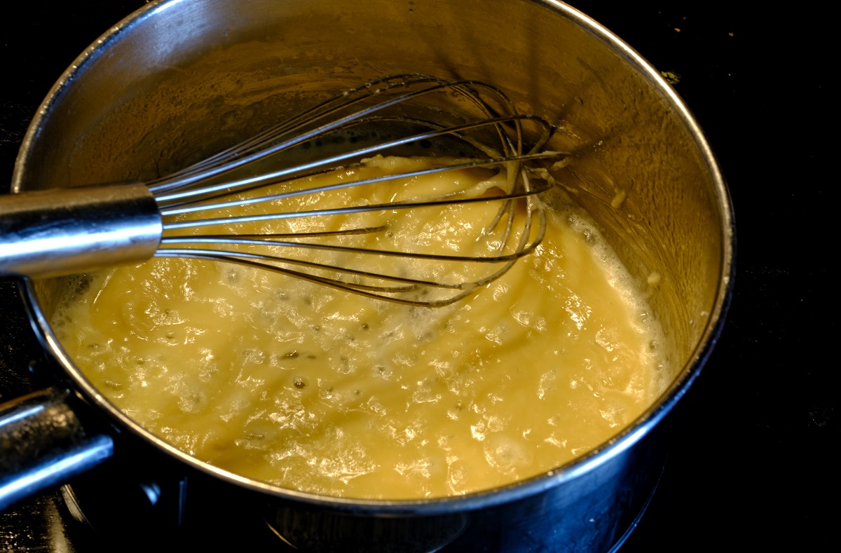 Η προσθήκη όλου του γάλακτος με τη μια θα έχει σαν αποτέλεσμα να σβολιάσει το μίγμα μας, ιδιαίτερα αν χρησιμοποιούμε κρύο γάλα. Προσθέτουμε περίπου το ένα τέταρτο του ζεστού γάλακτος και ανακατεύουμε δυνατά ώστε να διαλυθούν τυχόν σβώλοι πριν προσθέσουμε αργά το υπόλοιπο γάλα.