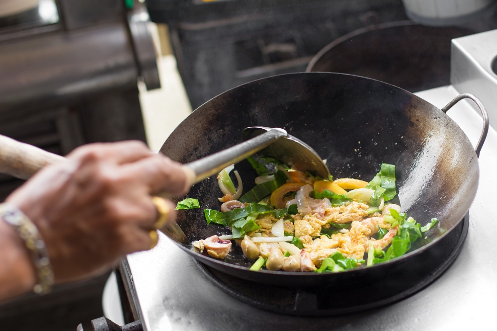 Για τον διάσημο σεφ, το τηγάνι είναι συνώνυμο με το γρήγορο μαγείρεμα. Συστήνει μάλιστα ένα βαρύ μαντεμένιο τηγάνι ή ένα wok – το κοίλο ασιατικό τηγάνι στο οποίο τηγανίζουμε, ανακατεύοντας συνεχώς, σύμφωνα με μια τεχνική που στα αγγλικά αποδίδεται ως strir fry. Η τεχνική αυτή προϋποθέτει πως έχουμε κομμένα από πριν τα λαχανικά μας σε julienne (λεπτά μπαστουνάκια ~0,3×0,3 εκ.), μέγεθος που μας επιτρέπει να μειώσουμε και τον χρόνο ψησίματός στα 2-3 λεπτά. Τα λαχανικά θα διατηρήσουν την αρχική υφή τους και το al dente τους. Το ίδιο λεπτά, σε φετούλες είτε σε λεπτές λωρίδες, μπορούμε να κόψουμε και το κρέας ή το ψάρι. Το μυστικό αυτής της τεχνικής είναι να διατηρούμε τη φωτιά πολύ δυνατή, ώστε να καραμελώσουν γρήγορα τα υλικά. «Έτσι δεν βράζουν», λέει χαρακτηριστικά, «και γίνονται πολύ πιο νόστιμα, γιατί προσθέτουμε ελάχιστα υγρά (ζωμό ή νερό) και με αυτά μαγειρεύονται». Είναι επίσης σημαντικό να έχουμε κόψει χωριστά τα υλικά μας ώστε να τα προσθέσουμε στο τηγάνι, σταδιακά, ανάλογα με τον χρόνο μαγειρέματος που χρειάζεται το καθένα, αρχίζοντας από αυτά που απαιτούν περισσότερο.