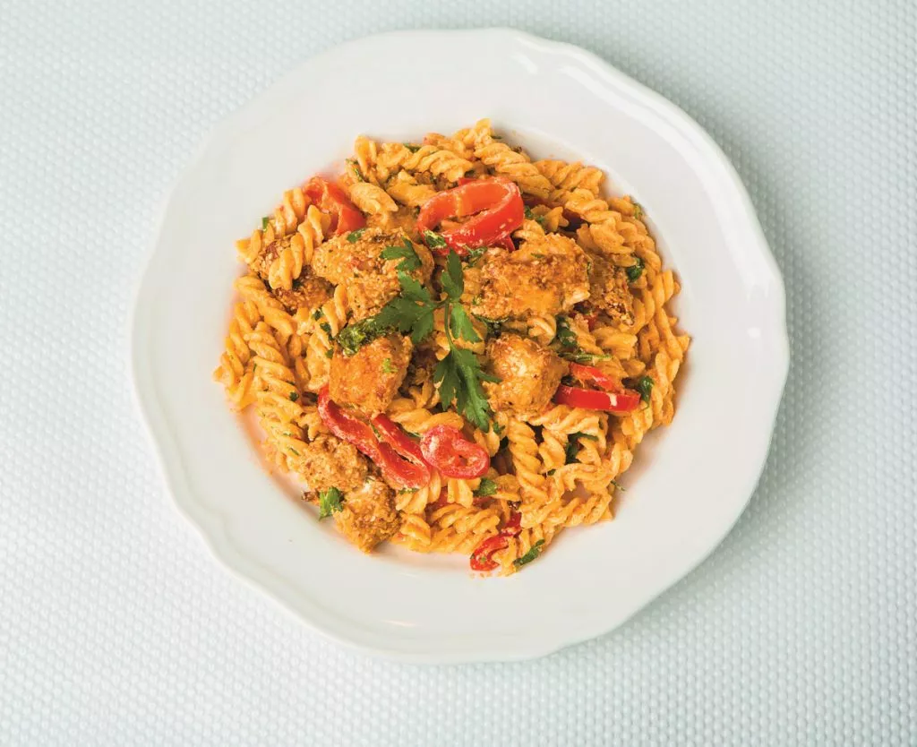 Μπουκίτσες κοτόπουλου πανέ σε σουσάμι, με ζυμαρικά και σάλτσα γιαουρτιού