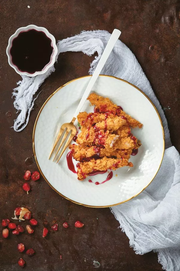 Στικ κοτόπουλου παναρισμένα και γλυκιά σάλτσα ροδιού