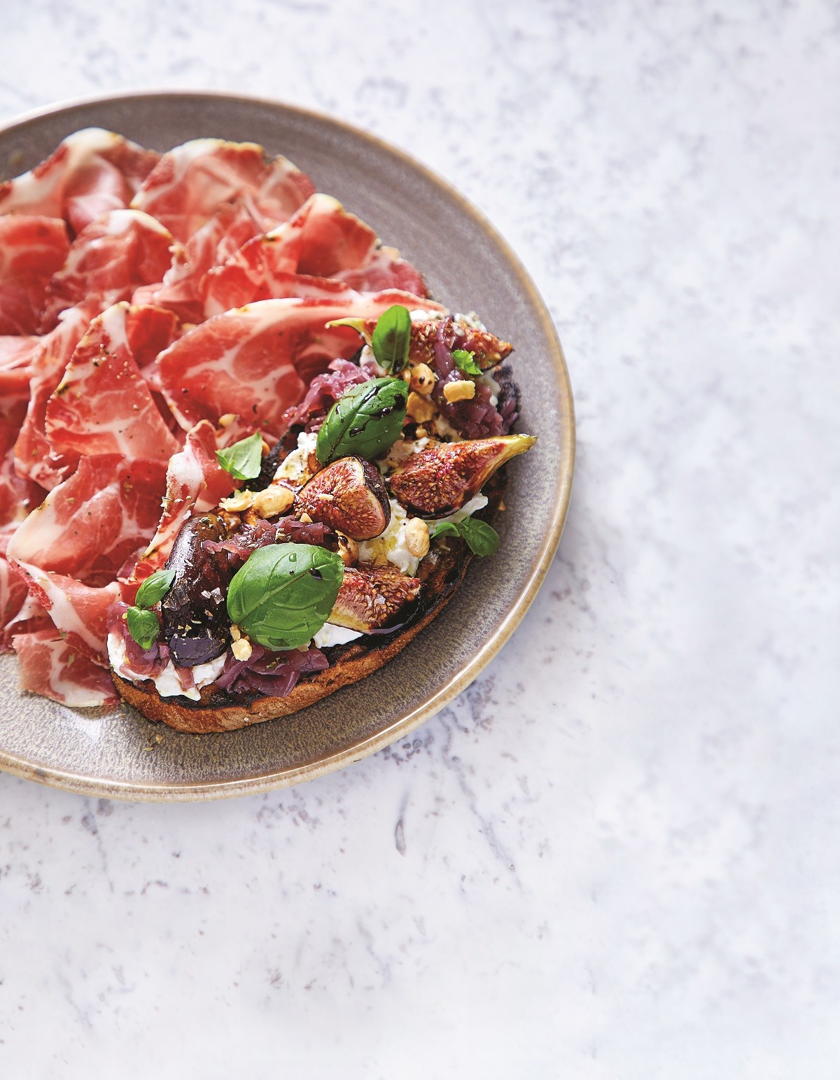 Μπρουσκέτα με μπουράτα, μαρμελάδα κρεμμυδιών, φρέσκα σύκα και προσούτο