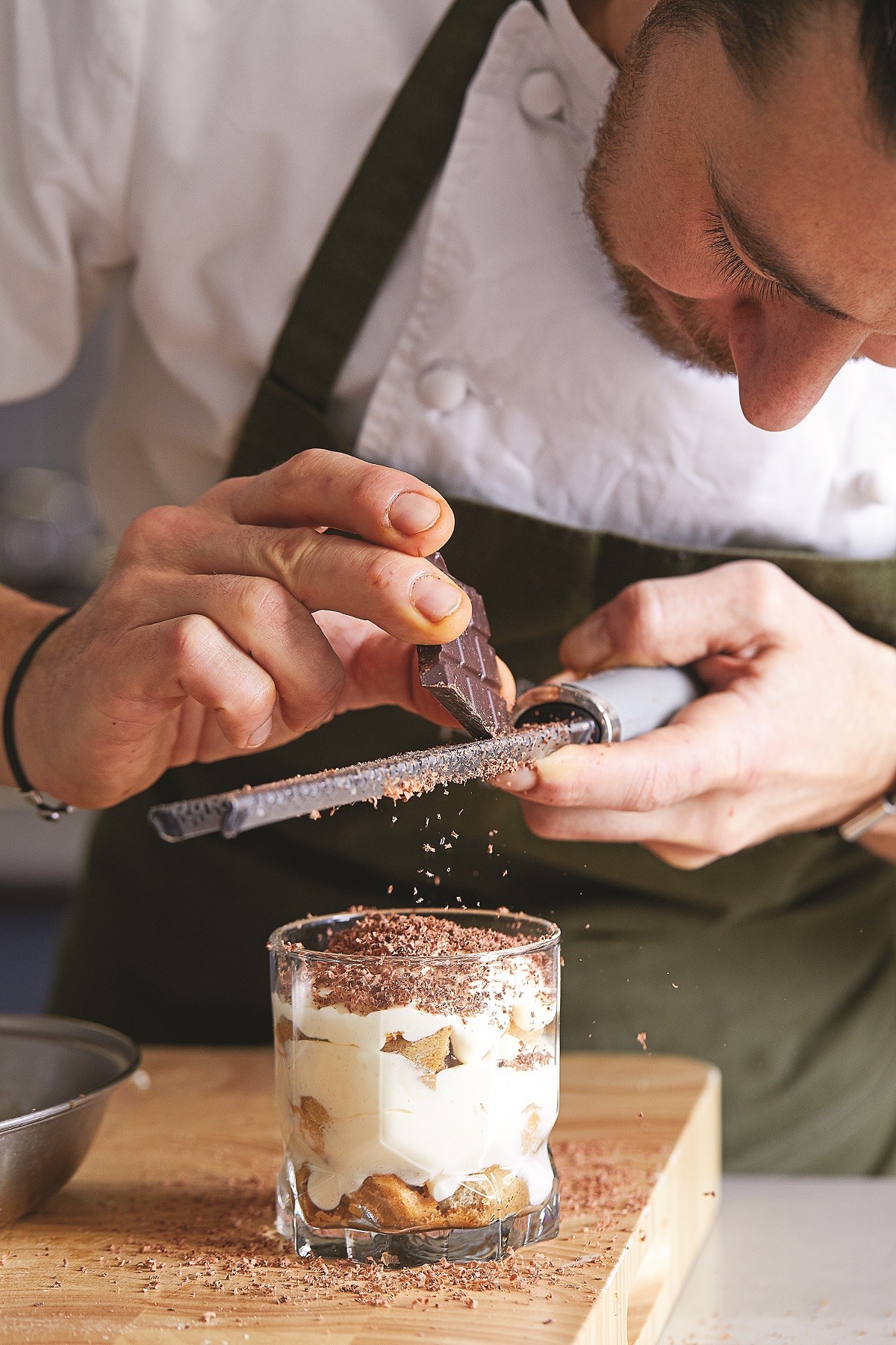 Σπάμε τα υπόλοιπα έξι μπισκότα και τα βουτάμε στο μείγμα καφέ – κονιάκ. Τα τοποθετούμε πάνω από την κρέμα και κατόπιν απλώνουμε το υπόλοιπο μείγμα κρέμας. Τελειώνουμε με την υπόλοιπη τριμμένη κουβερτούρα και βάζουμε στο ψυγείο. Σερβίρεται δροσερό.
