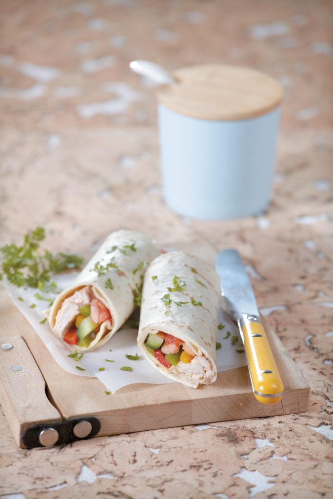 Και θρεπτικό και γρήγορο και υγιεινό και κρύο πιάτο για τις μέρες που δεν θέλετε να μαγειρέψετε. Μπορείτε να χρησιμοποιήσετε το κοτόπουλο που περίσσεψε από το μεσημέρι ή από χθες και να το βάλετε σε αραβικές πίτες. Τρώγεται για σνακ, για βραδινό, ενώ μεταφέρεται εύκολα στη δουλειά, στην παραλία…