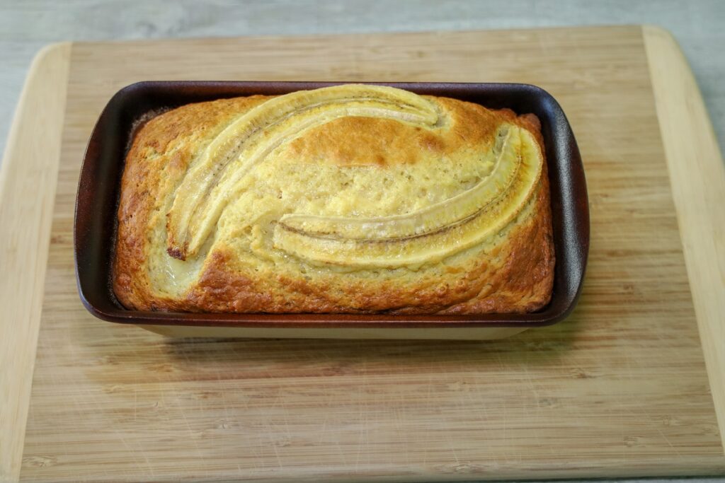 Γεμίζουμε με το μίγμα τη λαδωμένη φόρμα, τοποθετούμε επάνω στην επιφάνεια την 3η μπανάνα κομμένη στη μέση και φουρνίζουμε στους 180°C για 55-60 λεπτά. Θα πρέπει το κέικ να πάρει ένα χρυσαφένιο χρώμα και η οδοντογλυφίδα, που θα βυθίσουμε στο κέντρο του να βγαίνει στεγνή. Σε αντίθετη περίπτωση, αν βγάλει υγρό, το αφήνουμε μέσα στον φούρνο για λίγα λεπτά ακόμη. Ξεφορμάρουμε το κέικ και το αφήνουμε να κρυώσει καλά πάνω σε μια σχάρα, προτού επιχειρήσουμε να το κόψουμε.