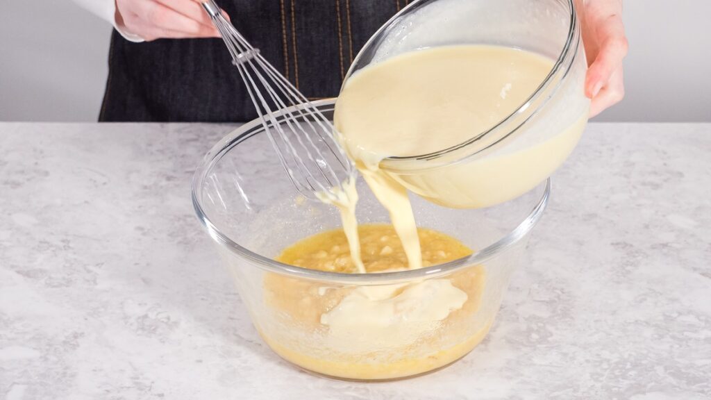 Λιώνουμε τις 2 από τις τρεις μπανάνες σε ένα μπολ πιέζοντας με ένα πιρούνι. Ρίχνουμε στο ίδιο μπολ το λιωμένο βούτυρο, το γάλα, το αυγό και τη βανίλια χτυπώντας με το σύρμα και τελευταία προσθέτουμε στο μίγμα τη ζάχαρη και αναμιγνύουμε καλά.