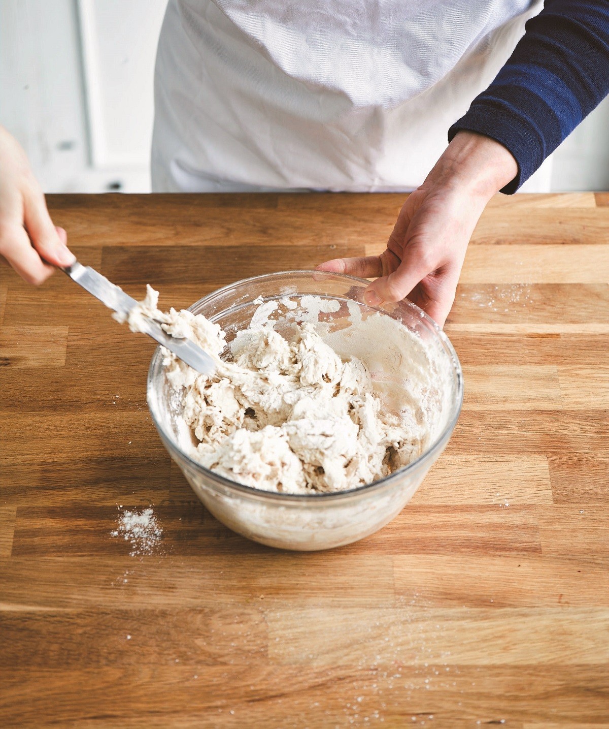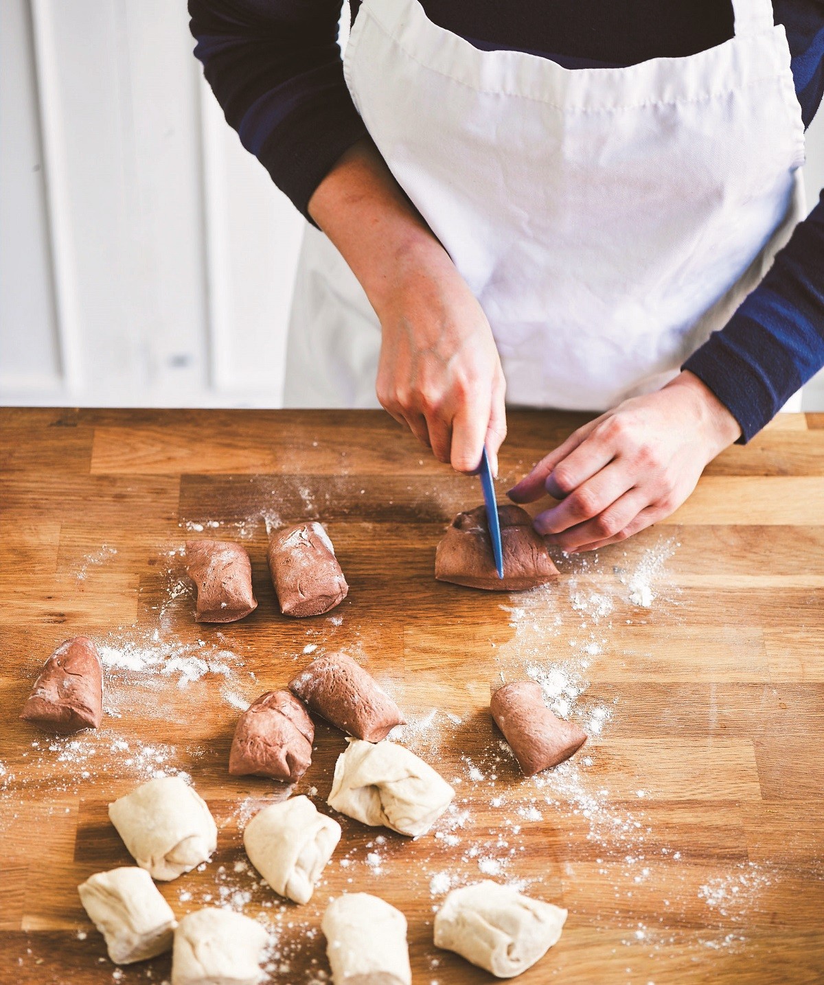 3. Προθερμαίνουμε τον φούρνο στους 220οC στον αέρα. Ακουμπάμε τα δύο ζυμάρια σε ελαφρώς αλευρωμένη επιφάνεια και χωρίζουμε κάθε μπάλα σε οχτώ μικρότερες. Τις ζυγίζουμε για περισσότερη ακρίβεια στο βάρος.
