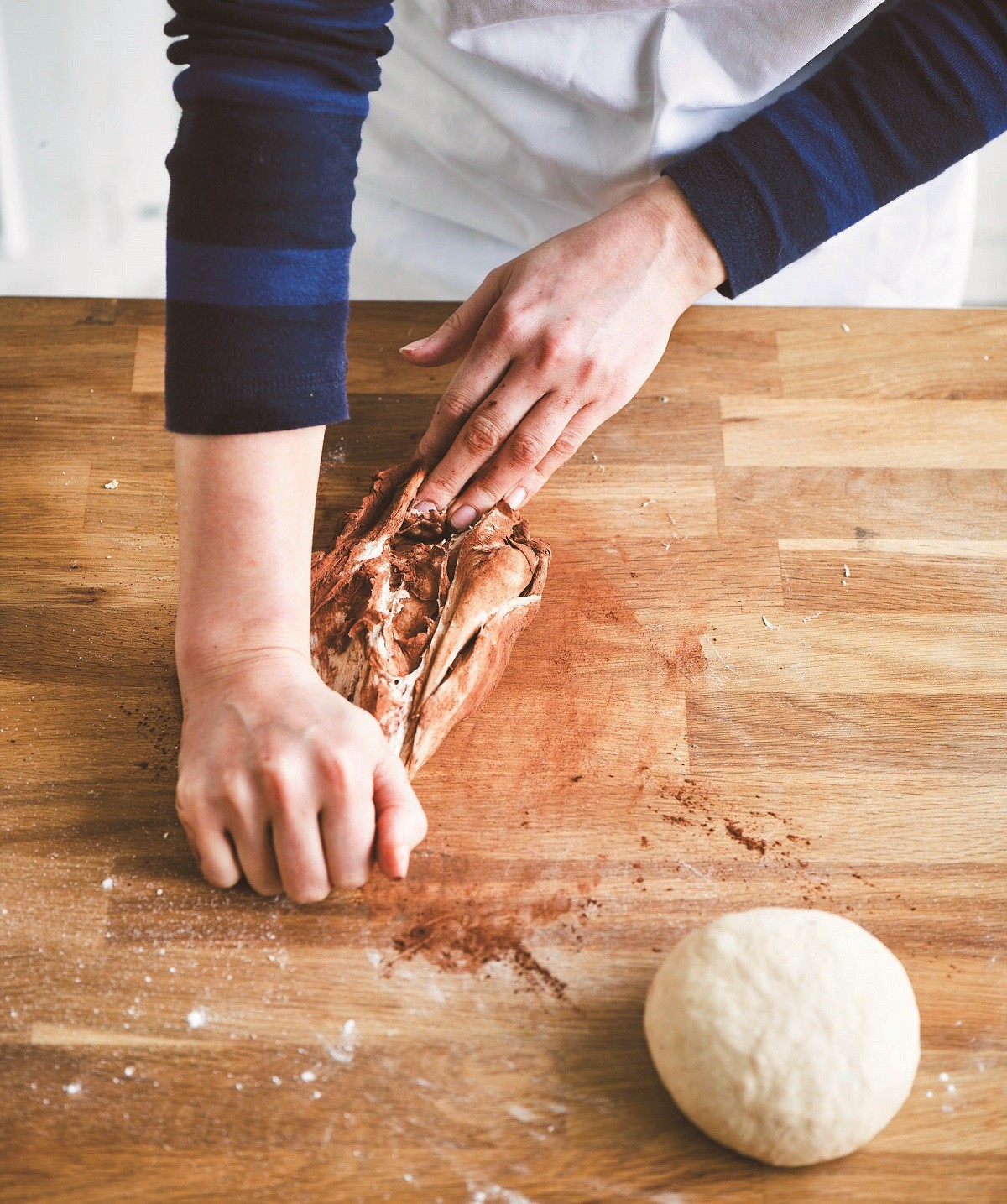 2. Ζυγίζουμε τη ζύμη και τη χωρίζουμε σε δύο ίσες μπάλες. Προσθέτουμε το κακάο στη μισή ζύμη και είτε ζυμώνουμε ξανά με τα χέρια είτε στο μίξερ με τον γάντζο, μέχρι να ενσωματωθεί το κακάο. Αν ζυμώνουμε με τα χέρια, ίσως χρειαστεί να προσθέσουμε ελάχιστο νεράκι, αν την έχουμε ζυμώσει σε πολύ αλευρωμένη επιφάνεια πιο πριν. Βάζουμε κάθε μπάλα ζύμης σε ξεχωριστό μπολ ελαφρώς λαδωμένο, σκεπάζουμε με αλουμινόχαρτο και τις αφήνουμε σε ζεστό μέρος χωρίς ρεύματα να διπλασιαστούν σε όγκο ή τις βάζουμε στο ψυγείο να φουσκώσουν αργά όλη τη νύχτα.