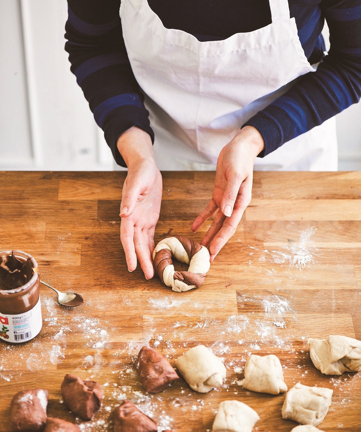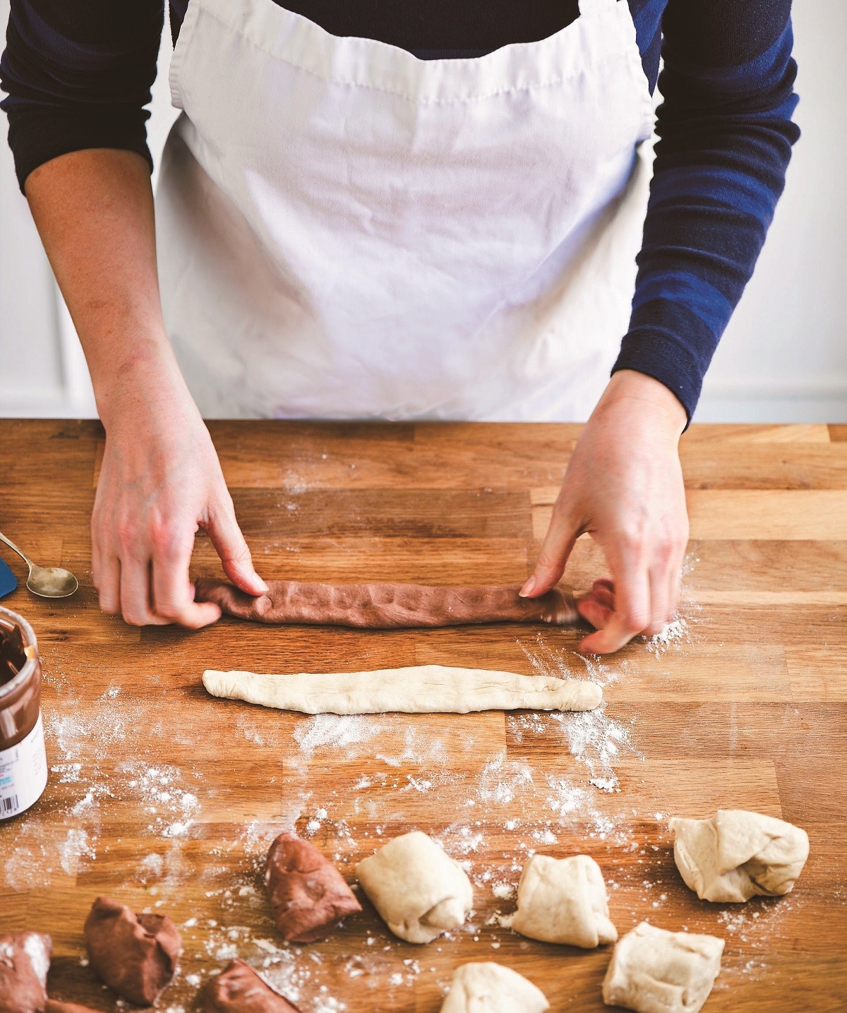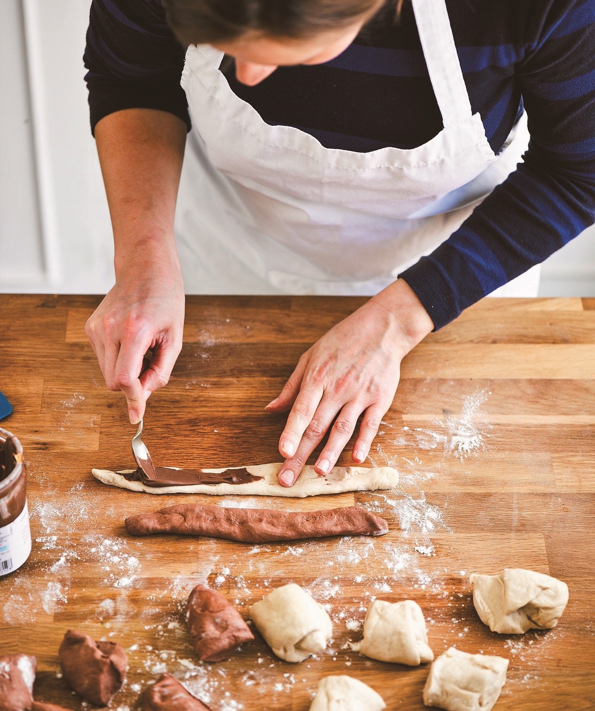 5. Με την πίσω πλευρά ενός κουταλιού απλώνουμε λίγη πραλίνα φουντουκιού στην απλή ζύμη, μετά ακουμπάμε τη σοκολατένια λωρίδα ακριβώς από πάνω και πιέζουμε να ενωθούν. Δεν βάζουμε πολλή πραλίνα γιατί δεν θα κολλήσουν μεταξύ τους ή δεν θα πλάθονται.