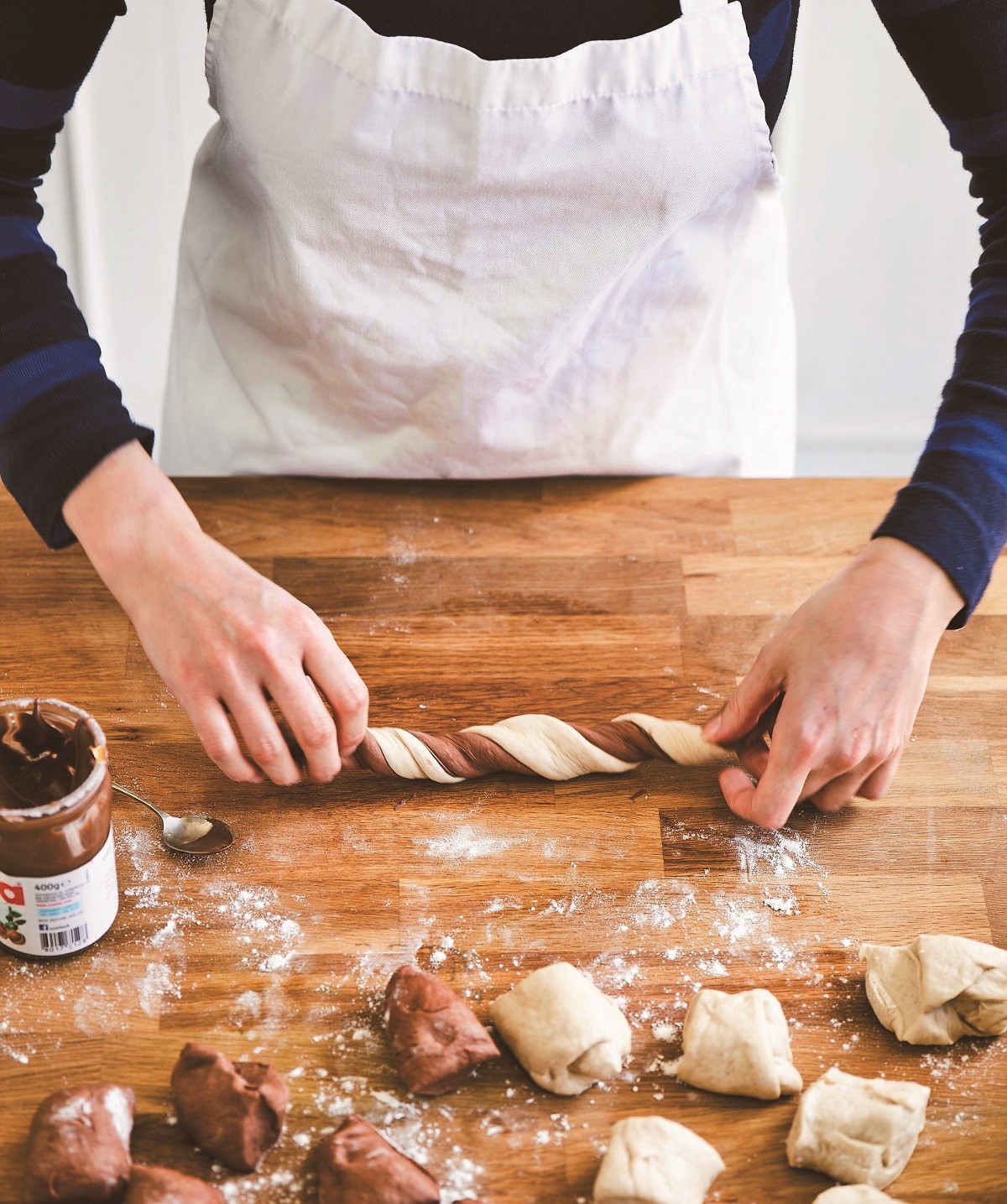6. Στρίβουμε τη ζύμη γύρω από τον εαυτό της σαν σπιράλ. Τη ρολάρουμε ελαφρά σε επιφάνεια εργασίας για να κολλήσουν οι δύο λωρίδες καλά μεταξύ τους.