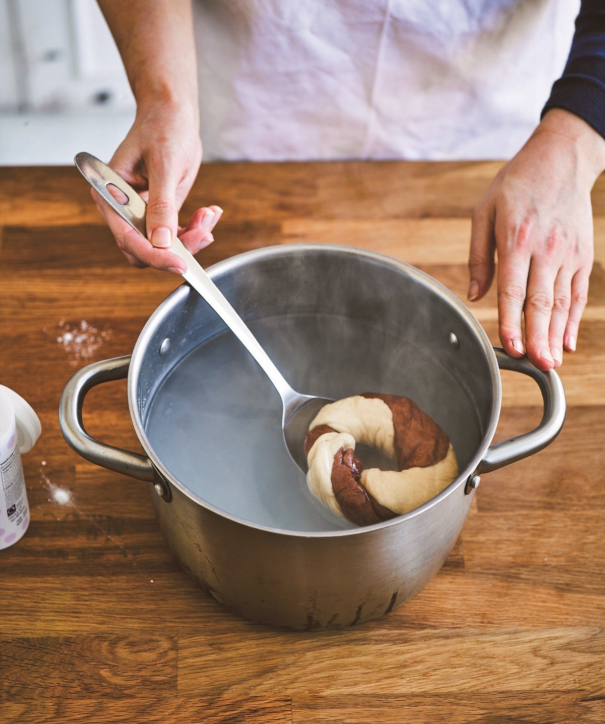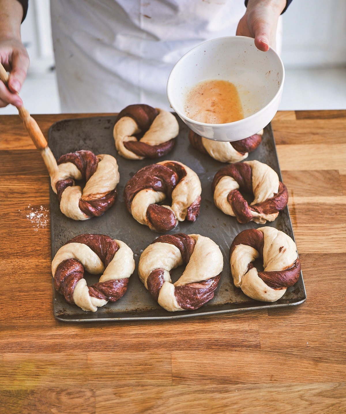 4. Ετοιμάζουμε ένα μπέιγκελ τη φορά. Παίρνουμε μια απλή και μια σοκολατένια μπαλίτσα ζύμης και τις ρολάρουμε δίνοντας σχήμα βέργας και στις δύο, διαστάσεων 2,5×3 εκ. περίπου. Πιέζουμε καθεμία με τα δάχτυλά μας προς τα κάτω να πλατύνει μέχρι να πάρουμε δύο μακριές λεπτές λωρίδες.