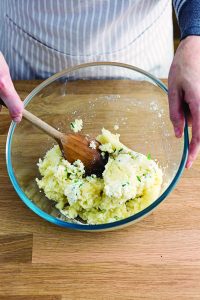 3. Περνάμε τις πατάτες από μύλο για πουρέ ή από ψιλό σουρωτήρι πιέζοντας με ξύλινη κουτάλα.