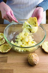 2. Κόβουμε τις πατάτες στη μέση, αφαιρούμε τη σάρκα με κουτάλι και τη ρίχνουμε σε καθαρό μπολ. Πετάμε τη φλούδα.