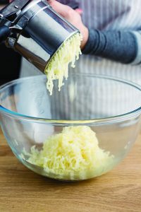 3. Περνάμε τις πατάτες από μύλο για πουρέ ή από ψιλό σουρωτήρι πιέζοντας με ξύλινη κουτάλα.