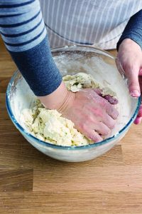 5. Κοσκινίζουμε από πάνω το αλεύρι και ζυμώνουμε να ενωθούν τα υλικά. Μοιράζουμε τη ζύμη σε οκτώ κομμάτια.