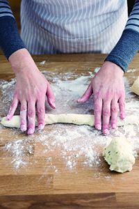 6. Αλευρώνουμε τον πάγκο μας, παίρνουμε ένα-ένα τα κομμάτια της ζύμης και τα πλάθουμε σε μακρόστενα ρολά, σαν λουκάνικα. Κατόπιν, τα κόβουμε σε κομματάκια μήκους 2,5 εκ.