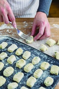 7. Με την πίσω πλευρά ενός πιρουνιού πατάμε ελαφρά κάθε νιόκι. Τα ακουμπάμε λίγα-λίγα σε αλευρωμένο ταψί συνεχίζοντας με τα υπόλοιπα.