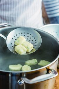 8. Βράζουμε τα νιόκι σε δόσεις σε κατσαρόλα, σε μπόλικο αλατισμένο νερό που κοχλάζει. Τα βράζουμε για περίπου 1΄ μέχρι να ανέβουν στην επιφάνεια και τα στραγγίζουμε σε σουρωτήρι. Αφήνουμε για 30΄΄ να στεγνώσουν και τα μοιράζουμε σε ζεστά μπολ σερβιρίσματος.
