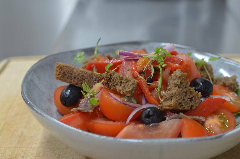 Αυτή η απλή συνταγή για καλοκαιρινή σαλάτα τύπου Panzanella, όπως την αποκαλούν οι Ιταλοί, έχει λίγα υλικά, που όλοι έχουμε συνήθως στο σπίτι, είναι γευστική και ετοιμάζεται στο πι και φι. Το καλό είναι ότι δεν σερβίρεται ζεστή, αλλά αφού κρυώσουν τα κρουτόν, οπότε μπορεί να γίνει και από πριν. Είναι μια ωραία ιδέα για μια απρόσμενη επίσκεψη φίλων στο σπίτι για το πρώτο δροσερό πιάτο, που θα ξεκινήσει ένα απλό τραπέζι της στιγμής. Ακόμη, θα μπορούσε να είναι ένα ελαφρύ κυρίως γεύμα, που θα πάρετε μαζί σας στη δουλειά ή γιατί όχι και σε μια παραλία, μέσα σε ένα ταπεράκι και ισοθερμική τσάντα, για να το προφυλάξετε από τις υψηλές θερμοκρασίες.